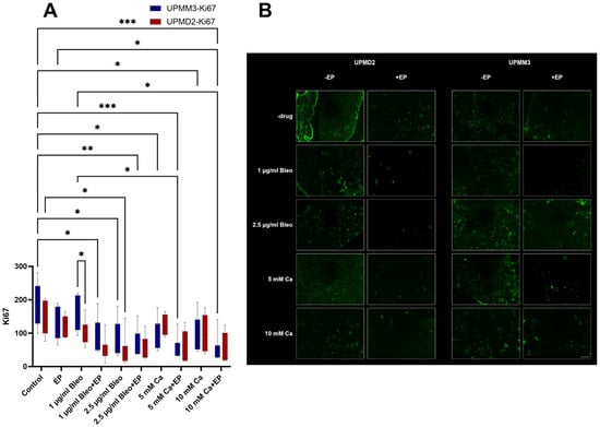 Quantitative evaluation of the Ki67 marker for the assessment of cell proliferation in the UPMM3 and UPMM2 cell xenografts, counts for positive cells per calculated area (A). A statistically significant decrease was observed in the groups treated with both EP and a drug agent. Higher doses of bleomycin or calcium chloride alone were required for a similar effect. Statistical analysis was performed using a two-way ANOVA and Tukey’s multiple comparisons test. Significance levels are indicated with * p < 0.05, ** p < 0.01, *** p < 0.001. Tumor images of immunofluorescence with Ki67 conjugated with Alexa Fluor 488 pro experimental treatment condition and cell line, 20× magnification (B). A prominent reduction of signal and therefore cell count for proliferation is noted between the applied agents with and without concomitant EP. A dose-dependent effect is documented for both tested drug agents. Scale bar 100 µm.