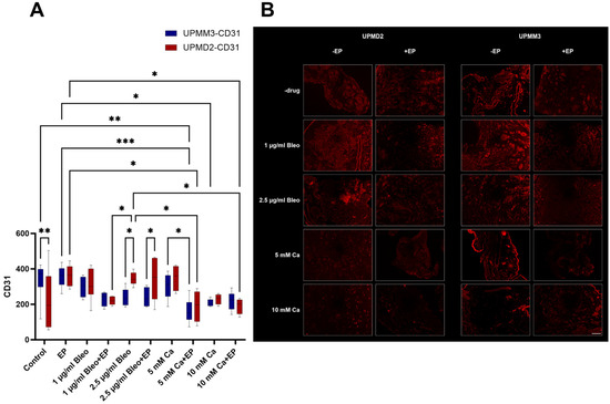 A significant reduction in the CD31 signal and therefore in the vascularization in comparison to the control group was exclusively documented for the tumors treated with 5 mM Ca combined with EP for the UPMM3 cell line (p = 0.0023). For the UPMD2 tumors, an apparent reduction was similarly documented with a statistically significant difference in comparison to the EP group (p = 0.034) but not to the control group for the same treatment condition. Only UPMM3 nodules treated with 10 mM Ca alone showed a significant difference in the detection of CD31 in comparison to EP alone (p = 0.043), whereas a prominent but not significant reduction was noted in UPMD2 nodules for this condition. A statistically significant decrease in the CD31-positive cell count was solely documented for UPMD2 tumors when treated with the combined application of 10 mM Ca and EP in comparison to EP alone (p = 0.036). A higher sensitivity of the UPMM3 cell line was discovered regarding the effect on angiogenesis and vascularization after treatment with 2.5 µg/mL bleomycin alone (p = 0.013) or with EP (p = 0.027). The described discrepancy could not be detected between the tested cell lines for the combination of 1 µg/mL bleomycin alone or with EP. The most prominent decline in CD31 fluorescent-positive cells could be achieved with ECT with 1 µg/mL bleomycin among all tested bleomycin conditions. Moreover, EP, 1 or 2.5 µg/mL bleomycin, and 5 mM Ca alone could not reproduce a similar effect on the detection of CD31 in the immunofluorescent staining (Figure 6A).