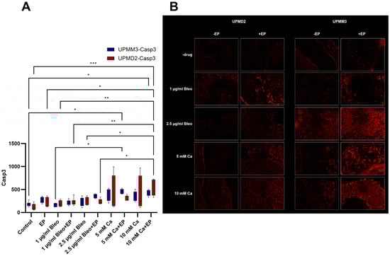 Quantitative evaluation of the caspase-3 marker for the assessment of the apoptotic rate in the UPMM3 and UPMM2 cell xenografts among the various treatment settings; counts for positive cells per calculated area (A). A statistically significant increase was observed in the group treated with 5 mM Ca and EP for the UPMD2 tumors and after application of 5 mM Ca and EP for the UPMM3 xenografts. Higher sensitivity levels to calcium in comparison to bleomycin were documented regarding the induction of apoptosis. Statistical analysis was performed using a two-way ANOVA and Tukey’s multiple comparisons test. Significance levels are indicated with * p < 0.05, ** p < 0.01, *** p < 0.001. Tumor images of immunofluorescence with caspase-3 conjugated with Alexa Fluor 594 pro experimental treatment condition and cell line, 20× magnification (B). A prominent increase of signal and therefore of the apoptotic rate was noted between the applied agents with and without concomitant EP, especially in the settings where calcium chloride was applied. Scale bar 100 µm.