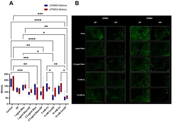The cross-sectional area was measured as an index of growth or regression after therapy to compare the effect of the tested modalities further quantitatively on the tumor size (Figure 9A,D). EP combined with 2.5 µg/mL bleomycin (p = 0.0023, UPMD2, p = 0.0036 UPMM3) as well as 5 (p = 0.0028, UPMD2, p = 0.0049, UPMM3) and 10 mM Ca (p < 0.0001, UPMD2, p = 0.024, UPMM3) induced a significant reduction of the calculated area between ED 7 and 18 for both UPMD2 and UPMM3 xenografts. UPMD2 tumors showed a similar sensitivity and tumor shrinkage after ECT with 1 µg/mL bleomycin (p = 0.0064). The tested drugs alone without EP induced only a slight size decrease without statistical significance.