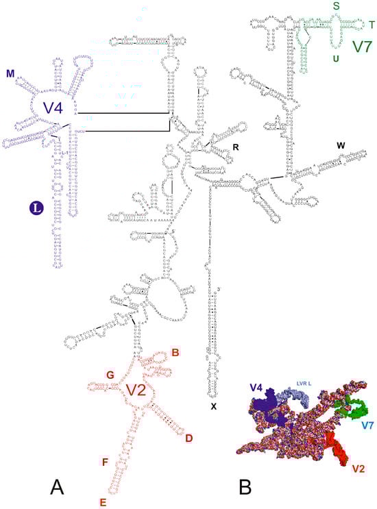 18S rRNA of Fromundus pygmaeus (A) Secondary structure model. The bases marked in colour represent the hypervariable regions (V2—red, V4—dark blue, V7—green). Thirteen length-variable regions (LVRs) are labelled as capital letters B to W in colours analogous to the base colours representing the hypervariable regions or other sequences’ regions. The capital letter in the filled circle indicates the LVR L. Base pairing is shown as follows: standard canonical pairs are lines (G–C, A–U), wobble G:U pairs are dots (G·U), A:G or A:C pairs are open circles (A; G, A; C) and other non-canonical pairs are filled circles (e.g., U and U, A and A). (B) Tertiary structure model. The fragments marked in colour represent the hypervariable regions (V2—red, V4—dark blue, V7—green). The LVR L region within the V4 hypervariable region is marked in dark grey.