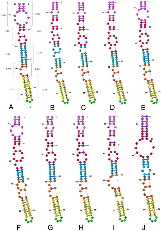 Secondary structure models of the length-variable region L characterised by 3–4 nucleotides in the subregion L2. (A) Thaumastella elizabethae (Thaumastellidae, outgroup). (B) Stibaropus indonesicus (Cydnidae: Cephalocteinae). (C) Fromundus pygmaeus (Cydnidae: Cydnidae: Geotomini). (D) Macroscytus badius (Cydnidae: Cydnidae: Geotomini). (E) Cyrtomenus emarginatus (Cydnidae: Cydnidae: Geotomini). (F) Rhytidoporus indentatus (Cydnidae: Cydnidae: Geotomini). (G) Adrisa romani (Cydnidae: Cydnidae: Geotomini). (H) Pseudoscoparipes fraterculus (Cydnidae: Cydnidae: Geotomini). (I) Cydnus aterrimus (Cydnidae: Cydnidae: Cydnini). (J) Ochetostethomorpha secunda (Cydnidae: Sehirinae: Sehirini). Specific subregion bases are marked in the same colour.