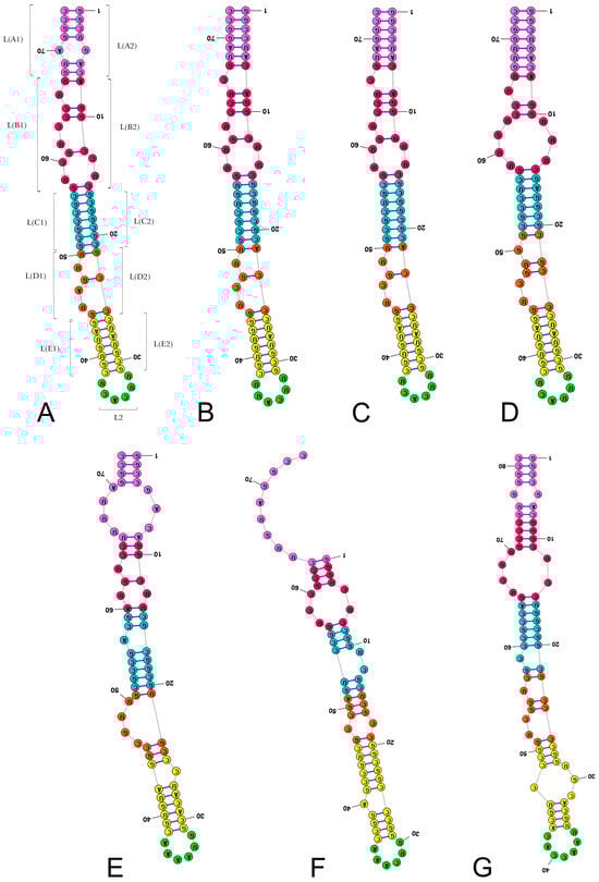 Secondary structure models of the length-variable region L characterised by 6–7 nucleotides in the subregion L2. (A) Thyreocoris scarabaeoides (Thyreocoridae). (B) Parastrachia japonensis (Parastrachiidae). (C) Adomerus buguttatus (Cydnidae: Sehirinae: Sehirini). (D) Amaurocoris curtus (Cydnidae: Amaurocorinae). (E) Garsauria aradoides (Cydnidae: Garsauriinae). (F) Amnestus zacki (Cydnidae: Amnestinae). (G) Chilocoris piceus (Cydnidae: Cydninae: Cydnini). Specific subregion bases are marked in the same colour.