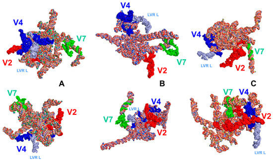 The LVR L position (marked in light blue) within the hypervariable region V4 in the tertiary structure models of the 18S rRNA gene in two different views. (A) Thaumastella elizabethae (Thaumastellidae, outgroup [1]). (B) Fromundus pygmaeus (Cydnidae: Cydninae). (C) Adomerus biguttatus (Cydnidae: Sehirinae). The hypervariable regions are marked in red (V2), dark blue (V4) and green (V7). All sequences were aligned to the outgroup sequence.