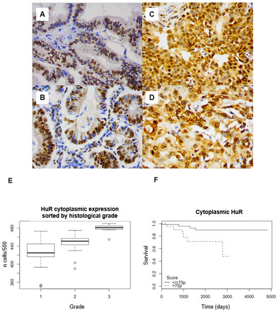 pHuR expression was predominantly nuclear with an average of 69.4% (95CI: 66.4–72.5) (Figure 3A–D). pHuR nuclear expression was inversely correlated with histological grade, with mean values of 78.4% (95CI: 74.9–81.8) in grade 1, 66.3% (95CI: 63.2–69.3) in grade 2, and 48.9% (95CI: 38.1–59.8) in grade 3 (p < 0.001) (Figure 3E). Its expression had no statistical association with the tumor stage (Kruskal–Wallis test: p = 0.2). There was a significant decrease in the expression of pHuR in the nuclei in the case lymph node invasion (53.5% vs. 68.9%, p = 0.009), as well as in the presence of LVSI (60.4% vs. 71.7%, p = 0.009). In terms of OS, there was a non-significant trend to a positive correlation with nuclear expression of pHuR (log-rank, threshold: median; p = 0.06) (Figure 3F). There was no significant correlation with PFS (log-rank test: p = 0.208) (Table 1).