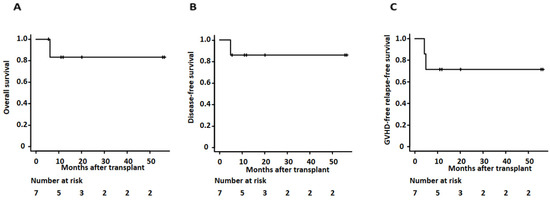 Overall, the 2-year overall survival and disease-free survival of our cases was 83.3% (95% confidence interval (CI): 27.3–97.9%) and 85.7% (95% CI: 33.4–97.9%) (as shown in Figure 2 and Table 3). Median days of neutrophil and platelet recovery were 16 (range of 13–23) and 28 (range of 17–75), respectively. The cumulative incidence of grade II-IV acute GVHD at day 100 and chronic GVHD at 1 year showed 28.6% (95% CI: 8–74.2%) and 28.6% (95% CI: 3–63.9%), respectively. The two-year relapse rate was 14.3% (95% CI: 2.14–66.6%). One patient relapsed and died as she could not receive her post-transplant maintenance therapy due to ongoing comorbidities, including fungal pneumonia. One-year GVHD free relapse-free survival (GFRS) at one year was 71.4% (95% CI 25.8–92%) (as shown in Figure 2 and Table 3).