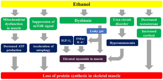 Chronic overconsumption of alcohol causes fatty degeneration in the liver first, followed by a gradual progression of hepatic fibrosis. Ethanol acts directly and indirectly on muscle cells, causing skeletal muscle atrophy and a loss of function [48]. There are six main possible mechanisms: (1) ethanol inhibits mitochondrial function and ATP production in skeletal muscle cells [49]; (2) ethanol and its metabolite acetaldehyde suppress mammalian target of rapamycin (mTOR) signaling, inhibit muscle protein synthesis, and promote autophagy [50]; (3) ethanol affects ZO-1 and claudin-1 binding, two important proteins in intestinal epithelial tight junctions [51], and also promotes the in vivo influx of endotoxins, and induces the production of inflammatory cytokines such as TNF-α, leading to increased myostatin in skeletal muscle and inhibiting the synthesis of muscle proteins (described later) [52]; (4) ethanol reduces gonadal function and decreases the production of testosterone, an anabolic hormone that activates muscle satellite cells and promotes muscle protein synthesis [53]; (5) alcohol intake increases cortisol, which is also a stress hormone, and cortisol breaks down skeletal muscle [53]; and (6) acetaldehyde inhibits ornithine transcarbamylase, a known rate-limiting enzyme in the urea circuit, resulting in increased blood ammonia levels [52] (Figure 1). Alcohol abstinence and sobriety are considered effective means of improving sarcopenia. Alcohol consumption and muscle mass show a strong inverse relationship regardless of gender [54].