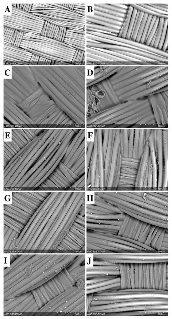 SEM image of a non-sealed vascular woven graft (A,B) sealed with gelatin A (C,E,G,I) or gelatin B (D,F,H,J). Gelatin film with antibiotics: Vancomycin (E,F), Ceftriaxone (G,H), and Rifampicin (I,J). Scale bars are 300 μm (A) and 100 μm (B–J).