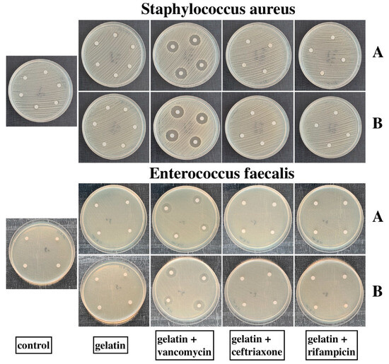 In our experiments, only Vancomycin provided antibacterial properties, regardless of which gelatin it was combined with. There are many studies that show the antibacterial effect of Rifampicin or Ceftriaxone [23,24], but we did not find such an effect.