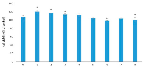Viability of EA.hy926 cells after 72 h of incubation with the extracts. Data (n = 6 in each group) are presented as mean ± SD. The control group consisted of cells cultivated in complete DMEM/F12 medium without samples. Group No. 0 included the control samples without gelatins and antibiotics. *—p ≤ 0.05 compared to sample No. 0.