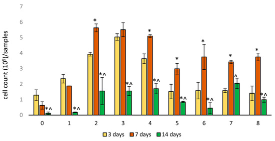 After 3 days of cultivation, the largest number of EA.hy926 cells was found in sample Nos. 2–4 (Figure 4). For sample No. 0 and 5–8, the number of cells was smaller but comparable to each other. After 7 days, an increase in the number of cells was detected in sample Nos. 2–8 (p < 0.05). A non-significant decrease in the number of attached cells was noted for sample No. 0 and No.1. On the 14th day, we observed a significant decrease in the number of adhered cells for all studied samples. For sample No. 0 and No. 1, the number of attached cells was the smallest. It should be noted that for sample No. 0, the number of attached EA.hy926 cells was the smallest over the entire observation period. The significance of the differences between samples in cell numbers after 3, 7, and 14 days of incubation is presented in Tables S2–S4.