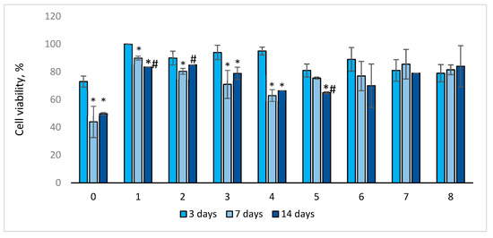Viability of EA.hy926 cells depending on the days of sample cultivation. Trypan blue staining is presented as mean ± SD a (n = 5 in each group). *—p < 0.05 compared to 3 days; #—p < 0.05 compared to 7 days.