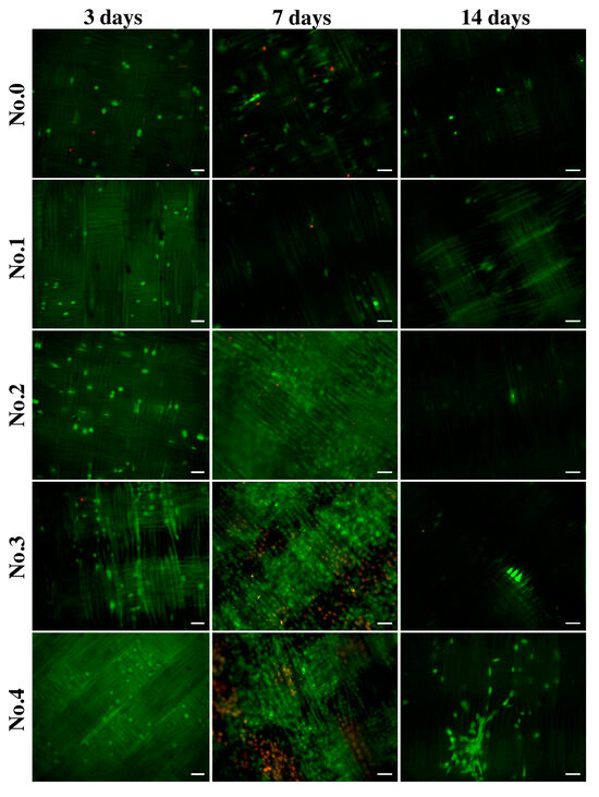 Fluorescence microscopy images of EA.hy926 cells on gelatin-coated samples after three, seven, and fourteen days of culture. Staining was performed using acridine orange (green, live cells) and propidium iodide (red, dead cells). The scale bar is 50 µm.