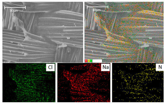 We believe that it would be most appropriate to identify cells using typical intracellular elements: K, P, and S. This approach required a rather long scanning to obtain an adequate map since the amount of these elements is very small compared to C, O, Na, Cl, and N (Figure S6). In addition, the potassium and sulfur maps are very diffuse, but P can reliably reflect the localization of the cell (Figures S5 and S6). Using this approach, we visualized a large number of cells located along the polyester fibers in the deep layers of the graft wall.