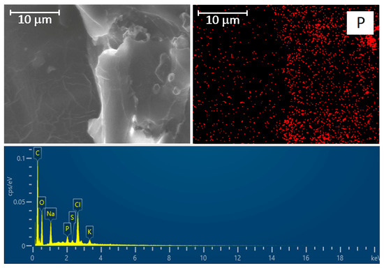 (Top row): SEM image of the graft wall cross-section and distribution of phosphorus (P). The scale bar is 10 μm. (Bottom row): EDS spectrum of the observation field.