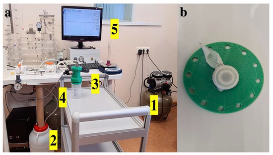 (a) Permeability testing according to ISO 7198:2016(E). 1—air compressor, 2—tank for distilled water, 3—sample fixation device, 4—water pressure sensor installed in the fixation device, and 5—pressure information is displayed on the monitor. 1 (b) Fixation of the test sample in a straightened state with a rubber rim into the 0.78 cm2 aperture.