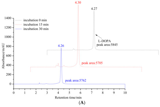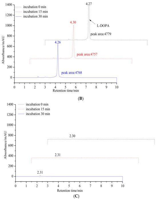 Monitoring changes in the content of L-DOPA oxidation products through HPLC analysis: (A). Incubation of L-DOPA as a diphenolase substrate for mTyr without 6′-O-caffeoylarbutin at 30 °C with incubation times of 0, 15, and 30 min. (B). Incubation of L-DOPA as a diphenolase substrate for mTyr in presence of 6′-O-caffeoylarbutin at 30 °C with incubation times of 0, 15, and 30 min. (C). Incubation of mTyr in the presence of 6′-O-caffeoylarbutin at 30 °C with incubation times of 0, 15, and 30 min at 30 °C.