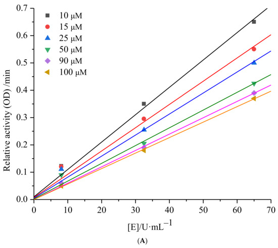 I. Enzyme inhibition mechanism study. For the investigation of the enzyme inhibition mechanism, L-DOPA was used at a final concentration of 0.5 mmol·L−1, and the mTyr was set at final concentrations of 8.1, 32.5, and 65.0 U·mL−1. The rate of change of optical density (OD) at 490 nm was measured for various concentrations of 6′-O-caffeoylarbutin (ranging from 10 to 100 μM). A graph was plotted to depict the relationship between the rate of change of OD values and the mTyr concentration under the influence of different concentrations of 6′-O-caffeoylarbutin.