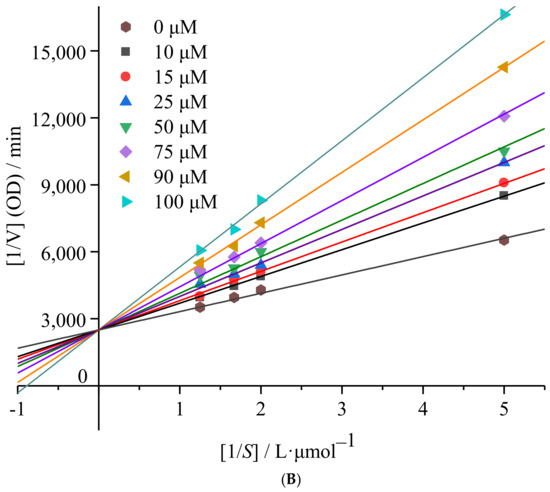 mTyr inhibition kinetics of 6′-O-caffeoylarbutin: (A). Inhibitory type of 6′-O-caffeoylarbutin on mTyr. (B). Lineweaver_Burk plots of 6′-O-caffeoylarbutin on mTyr.