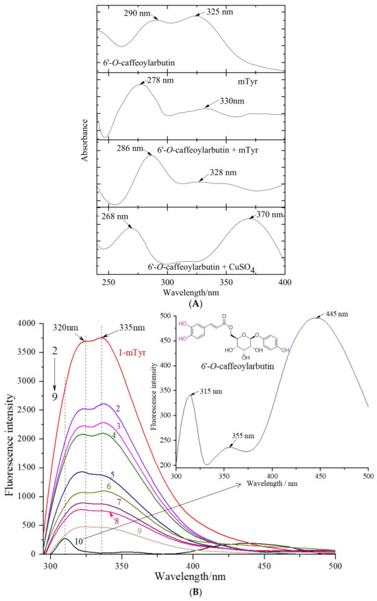 UV_vis spectra for the chelation of 6′-O-caffeoylarbutin with copper (II) ion in mTyr and fluorescence quenching effect of 6′-O-caffeoylarbutin on mTyr: (A). UV_vis spectra for the chelation between 6′-O-caffeoylarbutin and copper (II) ions. (B). Intrinsic fluorescence spectra of mTyr in the presence of 6′-O-caffeoylarbutin at different concentrations; the concentrations of 6′-O-caffeoylarbutin for curves 1–9 were 0, 5, 10, 15, 25, 50, 75, 90, and 100 μM, respectively; curve 10 represents the fluorescence intensity of 6′-O-caffeoylarbutin at the concentration of 0.02 μM.