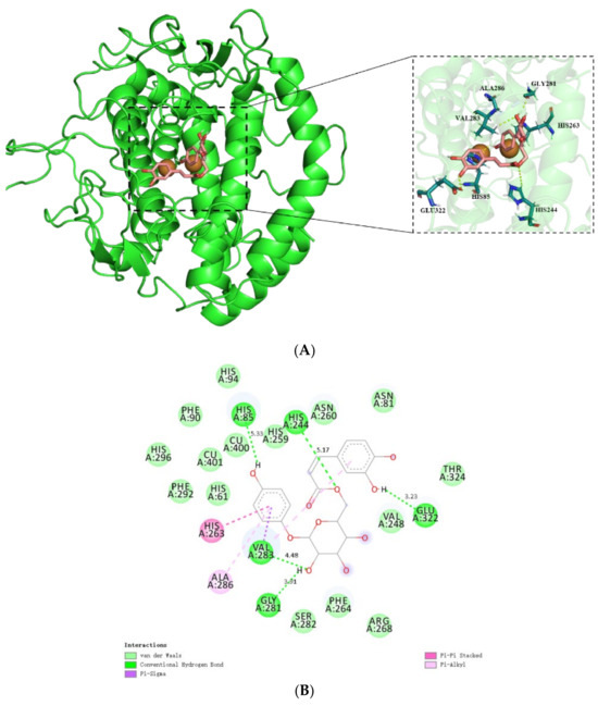 Molecular docking simulation of 6′-O-caffeoylarbutin with mTyr: (A). The docking of 6′-O-caffeoylarbutin with the pocket of mTyr. (B). The docking of 6′-O-caffeoylarbutin with amino acid residue of pocket of mTyr.