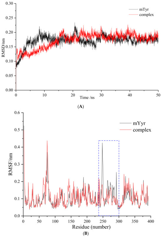 Molecular dynamics (MD) simulation of 6′-O-caffeoylarbutin with mTyr: (A). Root mean square deviation (RMSD) change curve. (B). Root mean square fluctuation (RMSF) change curve, blue dotted box denotes the peptide chain region of 240–300.