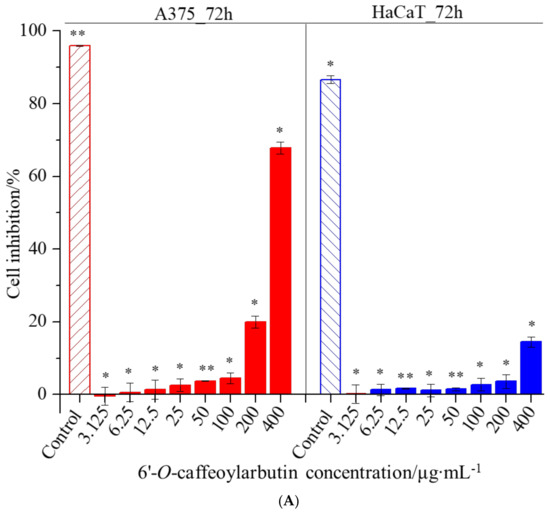 The effects of 6′-O-caffeoylarbutin on cell proliferation and cytotoxicity in A375 and HaCaT cells: (A). Dose-dependent response of 6′-O-caffeoylarbutin on A375 cells and HaCaT cells after 72 h of treatment. (B). Morphological changes of A375 cells and HaCaT cells with 6′-O-caffeoylarbutin, shown using an Olympus inverted biological microscope. * p < 0.05; ** p < 0.01.
