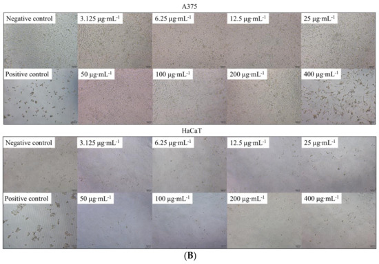 II. Cell viability assay. Cell proliferation and cytotoxicity assays were conducted using the Cell counting kit-8 (CCK-8) on A375 and HaCaT cells. Briefly, the cells were initially seeded in 96-well plates at a density of 4 × 104 cells per well and incubated for 24 h at 37 °C with 5% CO2 in a humidified incubator. Each treatment was performed in six duplicate wells. The tested compounds were added at various concentrations, and the cells were then incubated for 72 h. Following the incubation period, CCK-8 solution (Dojindo Laboratories, Kumamoto, Japan) was added to each well, and the plates were further incubated for 2 h. The absorbance of each well at 450 nm was measured using an absorbance microplate reader (BioTek ELx800, Winooski, VT, USA). The assay included negative controls in which cells were treated with ultrapure water and positive controls in which cells were treated with 10 µg·mL−1 taxol. The percentage of cell growth inhibition was calculated using the following Equation (3).