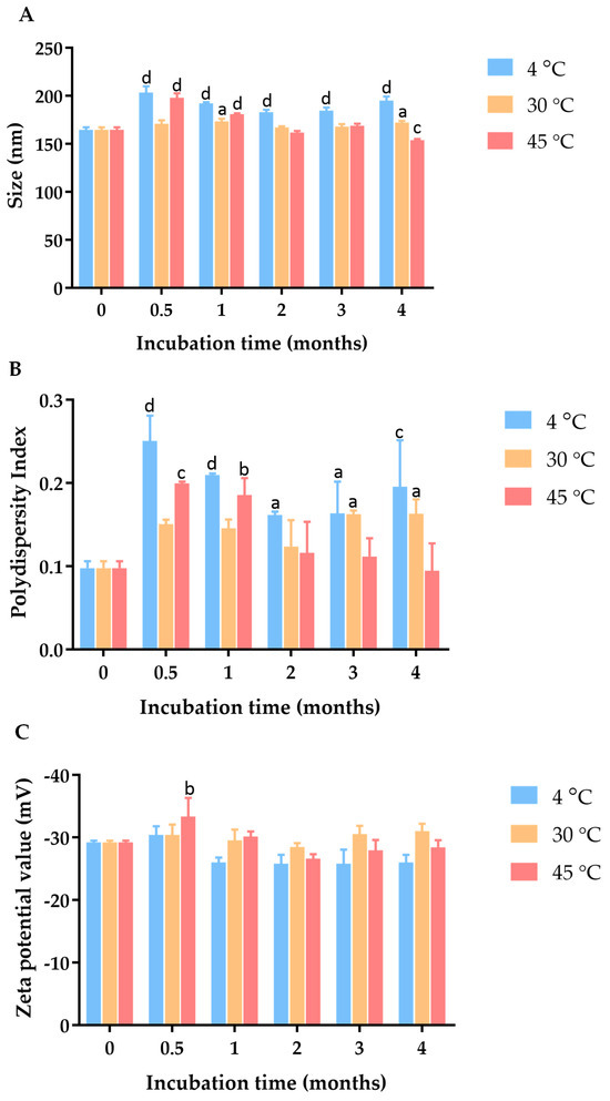 Effect of incubation time and temperature on (A) particle size, (B) PDI, and (C) zeta potential of C. chinense stem extract nanoparticles. Data are presented as the mean ± SD. The letters a, b, c, and d indicate p < 0.05, 0.01, 0.001, and 0.001, respectively. Tukey’s multiple comparisons test for size, polydispersity index, and zeta potential statistical analysis are shown in Supplementary Tables S1–S3.