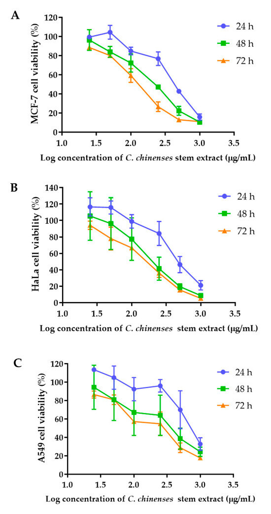 Clerodendrum is a significant plant genus used as a traditional medicine to treat a variety of disorders. Several in vitro and in vivo tests have been conducted to validate these traditional claims. Various species of Clerodendrum genus have potent antimicrobial, anti-inflammatory, anti-malarial, anti-diabetic, anticancer, analgesic, and antioxidant properties [15]. Qi reported that the diterpene compound isolated from C. chinense root extract demonstrated anticancer activities against HL-60 and A-549 cell lines [16]. Barung et al. showed that ethanol extract, hexane fraction, ethyl acetate fraction, and water-soluble fraction of C. chinense had anticancer activity on A549 lung cancer cells [17]. The ethyl acetate fraction had the lowest IC50 value and was classified as moderately active against lung cancer. Previously, we reported the anticancer activities of C. chinense leaf and flower extracts against MCF-7, A549, and HeLa cells [18,19]. The leaf and flower extract of C. chinense have undergone extensive research in various cancer cell lines; however, there remains a gap in the existing knowledge, as the anticancer activities of the stem extract in relation to a breast cancer cell line have never been investigated.