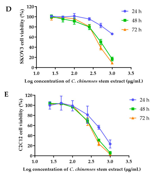Effect of C. chinense stem extract on viability and growth of (A) MCF-7 breast cancer cells, (B) HeLa cervical cancer cells, (C) A549 lung cancer cells, (D) SKVO-3 ovarian cancer cells, and (E) C2LC12 myoblast cells. Data are presented as the mean ± SD of the three independent experiments.