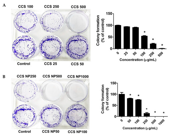 Effects of (A) C. chinense stem extract and (B) NPs on colony formation of the MCF-7 cancer cell lines. Data are presented as the mean ± SD of the three independent experiments. * indicates p < 0.05. Tukey’s multiple comparisons test for colony formation percentage statistical analysis are shown in Supplementary Table S4.