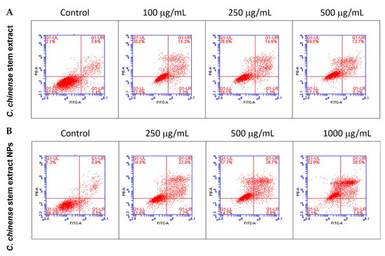 Flow cytometry analysis with Annexin V-PI staining was performed to evaluate the percentage of apoptotic cells in (A) C. chinense stem extract and (B) NP-induced MCF-7 cells.