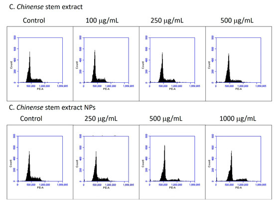 Cell cycle distribution was analyzed to further investigate the potential mechanism by which C. chinense stem extract and NPs depressed MCF-7 cell growth. MCF-7 cell lines were treated with C. chinense stem extract and NPs for 24 h followed by flow cytometry assays. The representative cell cycle distributions of MCF-7 cells exposed to C. chinense stem extract and NPs are presented in Figure 10. The results show that C. chinense stem extract caused G0/G1 phase arrest in MCF-7 cells at a concentration of 500 µg/mL (Table 5). In particular, the proportion of G0/G1 phase cells significantly increased as the concentration of the extract increased, which was accompanied by a decrease in the number of cells in the S phase and the G2/M phase. Therefore, the effect of C. chinense stem extract and NPs on the proliferation of MCF-7 cells is likely associated with cell cycle arrest.