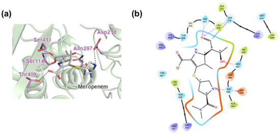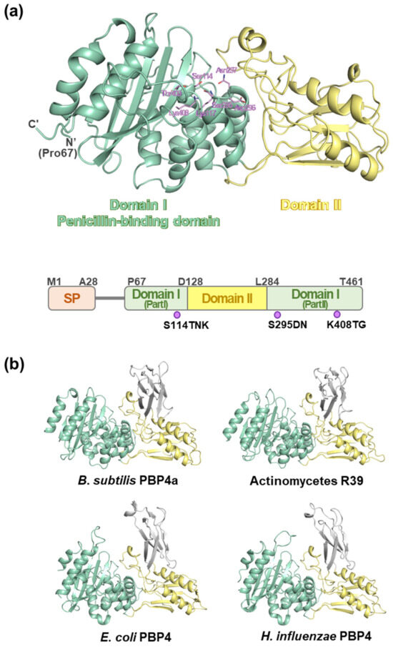 - Kishida, H.; Unzai, S.; Roper, D.I.; Lloyd, A.; Park, S.Y.; Tame, J.R. Crystal structure of penicillin binding protein 4 (dacB) from Escherichia coli, both in the native form and covalently linked to various antibiotics. Biochemistry 2006, 45, 783–792. [Google Scholar] [CrossRef] [PubMed]