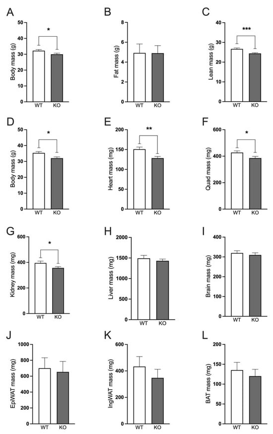 Whole-body composition data were assessed in 22–29-week-old mice, yielding lean mass, fat mass, free water mass and total water analysed by the EchoMRI-900 (EchoMRI Corporation Pty Ltd., Singapore) in accordance with the manufacturer’s instructions. Organ and fat weight were quantified in the same mice following sacrifice at 25–32 weeks of age, yielding mass for whole body, brown adipose tissue (BAT), inguinal white adipose tissue (ingWAT), epididymal white adipose tissue (epiWAT) brain, kidney, liver, heart and quadriceps. Whole-body composition data yielding lean mass, fat mass, free water mass, and total water were analysed by the EchoMRI-900 (EchoMRI Corporation Pty Ltd., Singapore) in accordance with the manufacturer’s instructions.