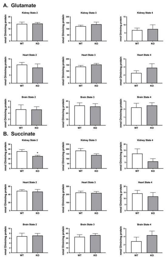 When using glutamate as the respiratory substrate, we found no difference in the level of mitochondrial respiration in brain, heart or kidney of the
