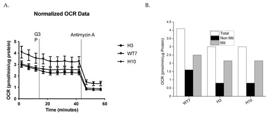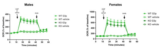 2 before starting the respirometry assay. Glycerol-3-phosphate (G3P, #94124 Sigma, Burlington, MA, USA) was injected at port A (5 mM final concentration, in MAS), and Antimycin A (A8674, Sigma) was injected at port B (4 mM final concentration, in MAS). Mix and measure times were 0.5 and 4 min, respectively. Oxygen consumption rate (OCR) was measured using an Agilent Seahorse XFe96 Analyzer (Agilent Technologies, Santa Clara, CA, USA), and Wave software (