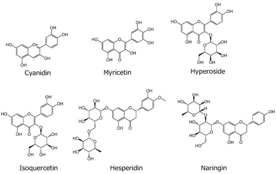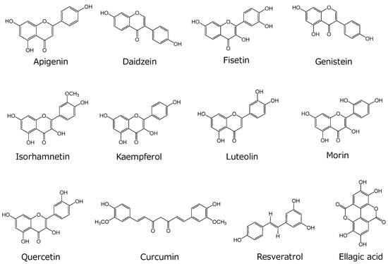 Ferulic acid (99%) was purchased from Sigma Aldrich (St. Louis, MO, USA). Ascorbic acid and quercetin (≤100%) were purchased from FUJIFILM Wako Pure Chemical Corporation (Osaka, Japan). Caffeic acid (≥98%), curcumin (100%), hesperidin (90%), rutin (95.0–101.5%), and triiodothyronine (T3) were purchased from Nacalai Tesque, Inc. (Kyoto, Japan). Gallic acid (≥98%), chlorogenic acid (≥95%), ellagic acid (≥95%), sesamin (≥95%), epigallocatechin-3-gallate (≥96%), genistein (≥98%), daidzein (≥95%), luteolin (≥98%), theaflavin (≥98%), isoquercetin (98%), and morin (100%) were purchased from Cayman Chemical Company (Ann Arbor, MI, USA). Resveratrol (>99.0%), fisetin (>96.0%), isorhamnetin (>95.0%), and troxerutin (90%) were purchased from Tokyo Chemical Industry Co., Ltd. (Tokyo, Japan). Cyanidin chloride (99%) was purchased from Nagara Science Co. Ltd. (Gifu, Japan). Apigenin (≥98%) was purchased from LKT Laboratories, Inc. (St. Paul, MN, USA). Kaempferol (98%), myricetin (98%), and naringin (98%) were purchased from BDL Pharmatech Ltd. (Shanghai, China). Hyperoside (90–100%) was purchased from Toronto Research Chemicals Inc. (Toronto, ON, Canada). Neohesperidin (≥98%) was purchased from Chem-Impex International, Inc. (Wood Dale, IL, USA). All other chemicals were commercially available and had the highest possible purity.