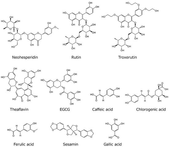 In recent years, polyphenols have received considerable attention owing to their antioxidant, antiviral, anti-inflammatory, and anticarcinogenic activities [,,,,]. Polyphenols have been reported to prevent major chronic diseases, including cardiovascular diseases, cancer, and diabetes [,,]. However, some flavonoids, a group of natural polyphenolic substances abundant in vegetables, fruits, grains, and tea, interact with drugs via transporters and metabolic enzymes [,,,,,] (Supplementary Table S1).