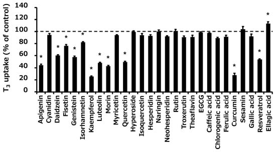 The cellular uptake of T3 was measured in monolayer cell cultures grown in 24-well plates. Cells were seeded at a density of 2.0 × 105 cells/well. Thereafter, the cells were incubated in a culture medium containing 5 mM sodium butyrate for 24 h before the uptake study. The cells were washed once with KH buffer (118 mM NaCl, 23.8 mM NaHCO3, 4.83 mM KCl, 0.96 mM KH2PO4, 1.20 mM MgSO4, 12.5 mM N-(2-hydroxyethyl) piperazine-N’-2-ethanesulfonic acid, 5.0 mM D-glucose, and 1.53 mM CaCl2; pH 7.4), followed by preincubation in KH buffer. Cellular uptake was initiated by adding T3-containing KH buffer with or without each flavonoid. Uptake was terminated after 10 min by replacing the incubation buffer with ice-cold KH buffer. The cells were washed twice with ice-cold KH buffer. The concentration of T3 was measured using liquid chromatography/tandem mass spectrometry (LC/MS/MS). Cellular uptake was presented as the uptake amount divided by the amount of cellular protein quantified using the Bradford protein assay. The experiment was performed in triplicate (n = 3) and repeated three times. Flavonoids, except ellagic acid, were dissolved in dimethyl sulfoxide (DMSO) at a final concentration of less than 0.5%. A stock solution of ellagic acid (20 mM) was obtained by dissolving it in 0.05 M NaOH and was further diluted to 100 µM in KH buffer (the pH was adjusted to 7.4).