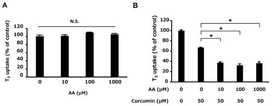 Inhibitory effects of curcumin on OATP4C1-mediated transport under the presence of AA. (A) Cells were incubated with 1 µM T3 with AA for 10 min at 37 °C. The AA concentrations were 0, 10, 100, and 1000 µM. (B) Cells were incubated with 1 µM T3 and 50 µM curcumin with or without 10, 100, and 1000 µM AA for 10 min at 37 °C. The amount of OATP4C1-mediated uptake was calculated by subtracting the nonspecific uptake of T3 by mock cells from the total cellular uptake by the OATP4C1-expressing cells. Data are shown as the mean ± SE (n = 3). N.S., not significantly different. * p < 0.05, significantly different.