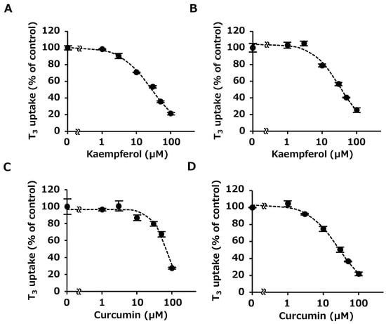We investigated the concentration-dependent inhibition by kaempferol and curcumin, which resulted in more than 70% inhibition of OATP4C1-mediated T3 uptake. The inhibition curve was fitted to the Rodbard model. The half-maximum inhibitory concentration (IC50) values of the food ingredients were calculated using JMP Pro 16 (SAS Institute Inc., Cary, NC, USA). The absolute inhibitory constant (Ki) was then derived using the following equation (Equation (1)) [,]: where [S] is the substrate concentration and Km is the Michaelis–Menten constant. The experiment was performed in triplicate (n = 3) and repeated three times.