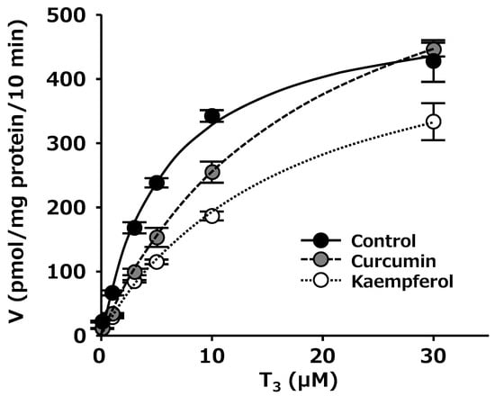 Further, we performed a kinetic analysis to clarify the mechanism of inhibition by curcumin and kaempferol. Alteration in the kinetic curves was observed both in the presence of curcumin and kaempferol (Figure 6). The obtained kinetic parameters (Km, Vmax, and Vmax/Km values) are summarized in Table 2. Kinetic analysis revealed that curcumin and kaempferol addition increased the Km values of OATP4C1-mediated T3 uptake (control, 6.06; curcumin, 20.8; kaempferol, 17.6 (µM)). Moreover, reductions in Vmax/Km values were observed in the presence of those inhibitors (control, 88.8; curcumin, 39.7; kaempferol, 31.8 (µL/mg protein/10 min)).