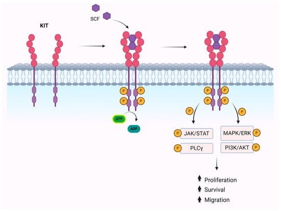The downstream signaling of KIT involves the activation of MAPK/ERK, PI3K/AKT, PLCγ, and JAK/STAT pathways []. The MAPK/ERK pathway is activated by the phosphorylation of Y703 and Y936 and plays a key role in transcription activation and cell proliferation []. The phosphorylation of Y721 activates the PI3K/AKT pathway, which promotes cell survival and escape from apoptosis []. In addition, the activation of the Src family of kinases (SFK) can occur, resulting in cell proliferation and survival through Akt phosphorylation and cell migration through the phosphorylation of focal adhesion kinase [,,]. Finally, it has been shown that phosphorylation of some KIT tyrosine residues leads to JAK/STAT activation with the translocation of STAT proteins into the nucleus, where they target specific genes [,] (Figure 1). There are also negative feedback mechanisms to control the signal once the KIT receptor is activated. Among these, ubiquitination is the main mechanism. E3 ubiquitin-protein ligase c-CBL binds directly to the activated KIT receptor through Y568 and Y936 or indirectly through Grb2 to Y703 and Y936 or through the p85 subunit of PI3K [,]. Additional mechanisms include dephosphorylation and PKC-dependent serine phosphorylation. Finally, signal inactivation can occur through phosphatases such as Src homology region 2 domain-containing phosphatase 1, which causes KIT dephosphorylation.