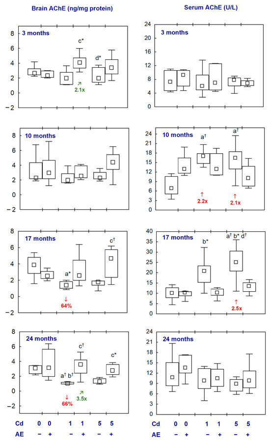 The concentration of acetylcholinesterase (AChE) in the aliquots of the brain homogenates and its activity in the serum of rats administered with cadmium (Cd) at 0, 1, or 5 mg/kg of diet and/or Aronia melanocarpa L. berries extract (AE). Different from the: a—Control group, b—AE group, c—Cd1 group, and d—Cd1 + AE group, where * p < 0.05 and † p < 0.01. The values below the bars indicate a percentage difference or a fold of difference in the median values between the respective groups (↓, lower than in the control group; ↑, higher than in the control group; ↗, higher than in the proper Cd group). The effect size (η2) for the differences in the concentration of AChE in the brain and its activity in the serum between the groups was large (0.241–0.555 and 0.349–0.505, respectively). Detailed data on AChE in the brain and serum are available in Table S1.