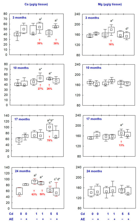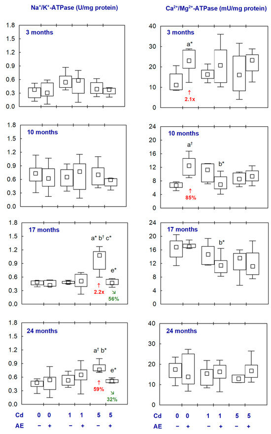 There were no differences in the above parameters between the Cd1 and Cd5 groups and between the Cd1 + AE and Cd5 + AE groups, except for a higher activity of Na+/K+-ATPase in the Cd5 group after 17 months, as well as a lower concentration of Ca after 24 months in the Cd5 group than in the Cd1 group and in the Cd5 + AE group than in the Cd1 + AE group and lower concentration of Mg after 3 months in the Cd5 + AE group as compared to the Cd1 + AE group (Figure 2 and Figure 3, Tables S2 and S3).