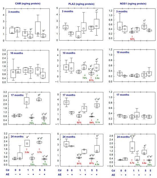 The concentrations of calmodulin (CAM), phospholipase A2 (PLA2), and nitric oxide synthase 1 (NOS1) in the aliquots of the brain homogenates of rats administered with cadmium (Cd) at 0, 1, or 5 mg/kg of diet and/or Aronia melanocarpa L. berries extract (AE). Different from the: a—Control group, b—AE group, c—Cd1 group, d—Cd1 + AE group, and e—Cd5 group, where * p < 0.05, † p < 0.01, and ‡ p < 0.001. The values below the bars indicate a percentage difference or a fold of difference in the median values between the respective groups (↑, higher than in the control group; ↓, lower than in the control group; ↗, higher than in the proper Cd group; ↘, lower than in the proper Cd group). The effect size (η2) for the differences in CAM, PLA2, and NOS1 concentrations between the groups was large (0.327–0.818, 0.276–0.838, and 0.403–0.575, respectively). Detailed data on CAM, PLA2, and NOS1 concentrations are available in Table S4.