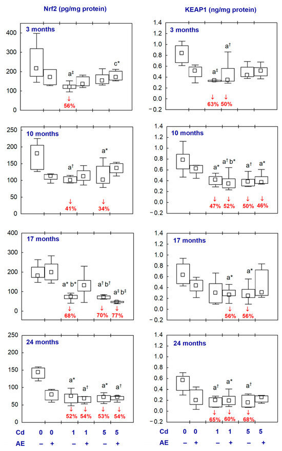 The concentration of Nrf2 in the Cd1 and Cd5 groups at all time points (except for its unaffected concentration in the Cd5 group after 3 months), Cd1 + AE group after 24 months, and the Cd5 + AE group after 17 and 24 months was lower (from 34% to 77%) than in the control group (Figure 5, Table S5).