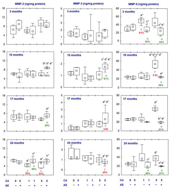 The concentrations of metalloproteinases (MMPs) such as MMP-2, MMP-3, and MMP-9 in the aliquots of the brain homogenates of rats administered with cadmium (Cd) at 0, 1, or 5 mg/kg of diet and/or Aronia melanocarpa L. berries extract (AE). Different from the: a—Control group, b—AE group, c—Cd1 group, d—Cd1 + AE group, and e—Cd5 group, where * p < 0.05, † p < 0.01, and ‡ p < 0.001. The values below the bars indicate a percentage difference or a fold of difference in the median values between the respective groups (↑, higher than in the control group; ↓, lower than in the control group; ↗, higher than in the proper Cd group; ↘, lower than in the proper Cd group). The effect size (η2) for the differences in MMP-2, MMP-3, and MMP-9 concentrations between the groups was medium-to-large (0.128–0.451, 0.289–0.546, and 0.388–0.683, respectively). Detailed data on the concentrations of determined MMPs are available in Table S6.